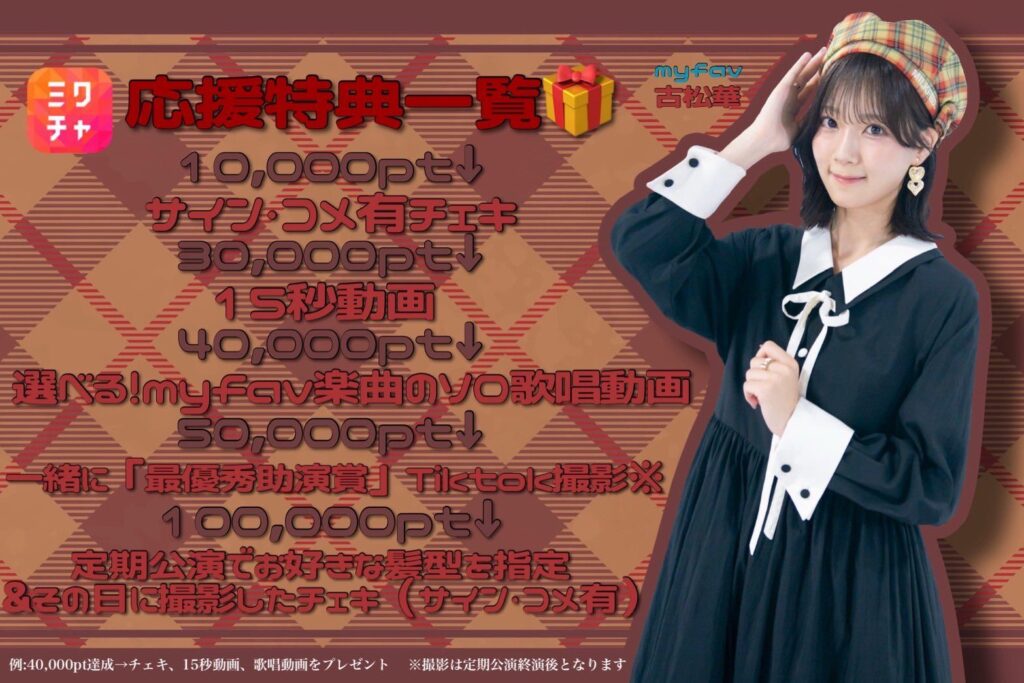 古松華本人より告知させていただいておりました、ミクチャ配信の応援特典に関してのお知らせです。