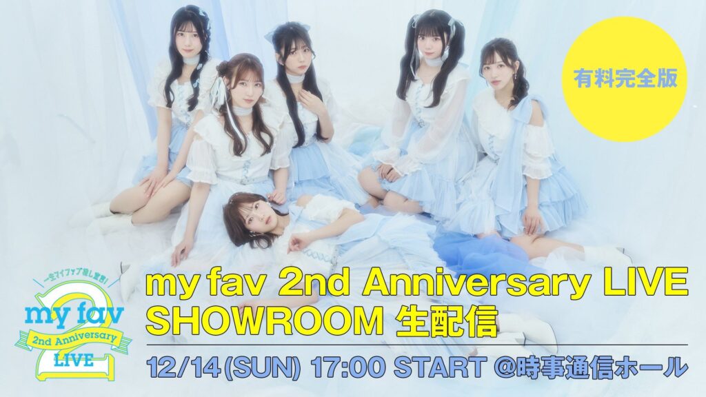 「my fav 2nd Anniversary LIVE 〜一生マイファブ推し宣言!〜」ですが、SHOWROOMイベントポイント達成&チケットSOLD OUTにつき、SHOWROOMにて公演の生配信が決定しました!
